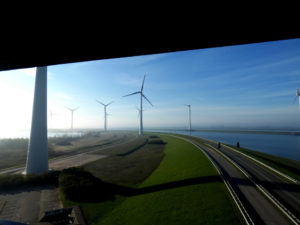 Terug naar de uitkijktoren: dinsdag was het eerst nog prachtig weer en spraken we toeristen die lid waren van â?? Vrienden op de fietsâ? en richting Antwerpen wilden. Ze genoten van het uitzicht op de toren en ik mocht ze het een en ander vertellen over de sluizen en natuurlijk de windmolens. Ze waren niet erg gesteld op molens en geloofden meer in kernfusie maar waren het met mij eens dat die ontwikkeling nog veel tijd, voorlichting en overtuigingskracht gaat kosten en dat je daar niet op kunt wachten dus nu iets alternatiefs nodig hebt en dan is windenergie zo gek nog niet. Later ging het betrekken, kwamen de wolken opzetten en was er zelfs bliksem. Twee enthousiaste jongens op racefietsen kwamen schuilen in de toren en vroegen me of de molens wel een bliksemafleider hebben. Ik vermoedde van wel omdat ik me een verhaal herinnerde over dieven die uit waren op het koper van de bliksemafleiders in molens. Net als veel andere bezoekers van dit windpark missen zij een goed informatiebord over het park. Ik wees ze op de website en de mogelijkheid een appje te installeren op hun mobieltje maar ook zij willen daarnaast een informatiebord. Ik vertelde dat zoâ??n informatieruimte in aantocht is via een wedstrijd onder ontwerpers.
