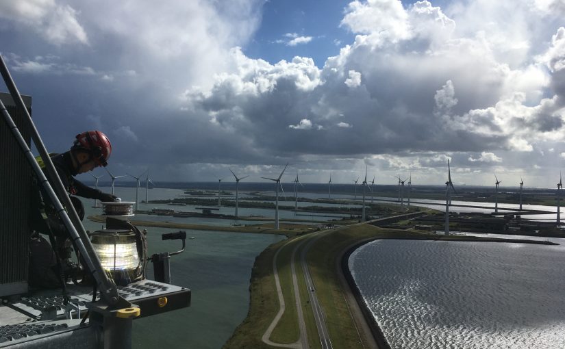 Foto: Monteur vervangt verlichting windturbine Windpark Krammer