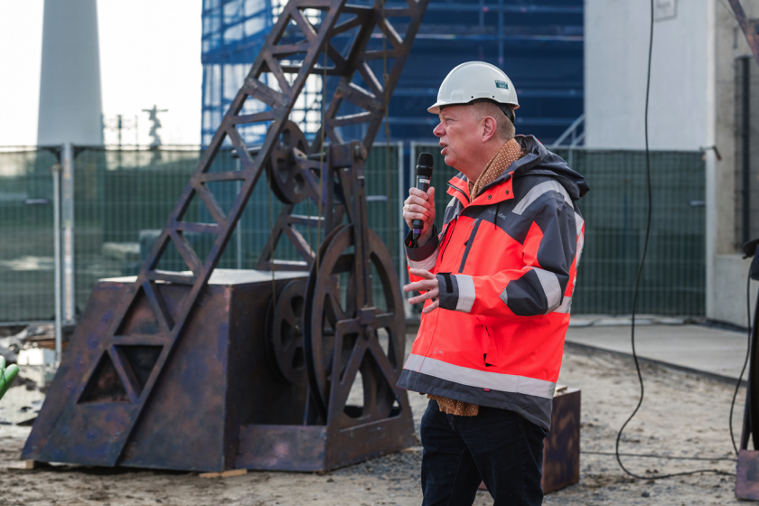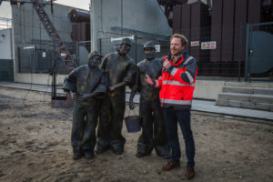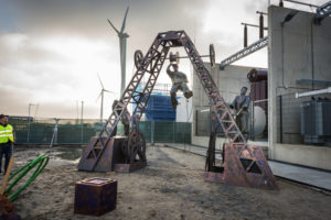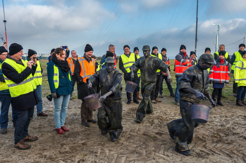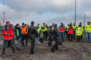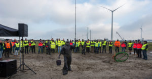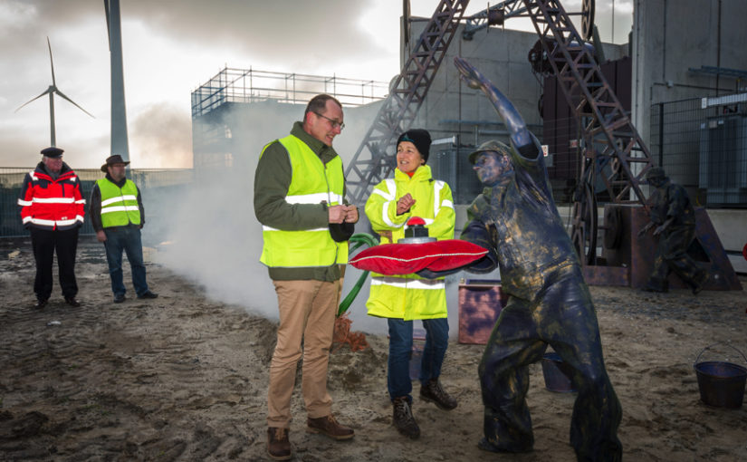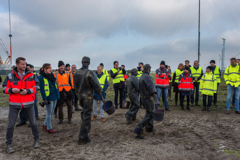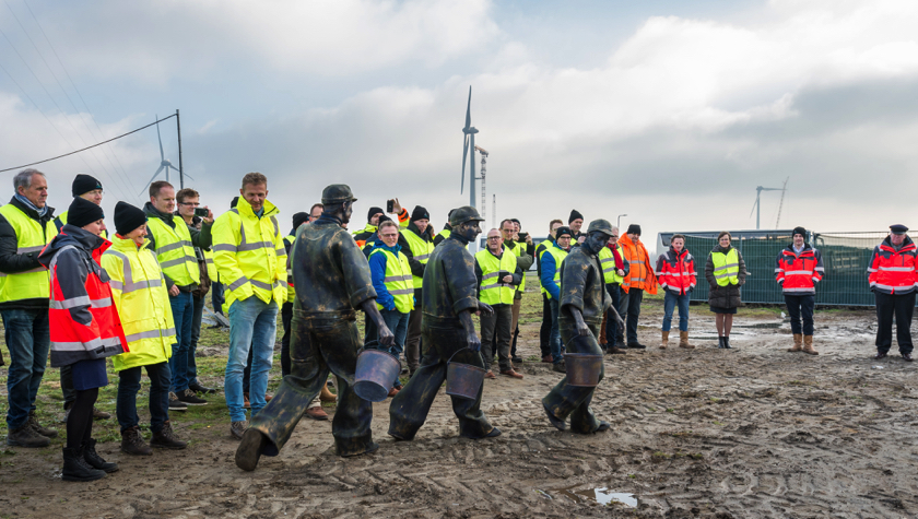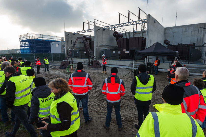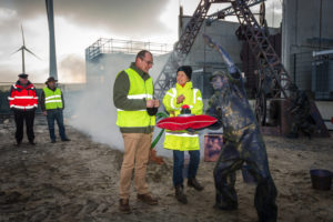 Een aantal weken geleden is de kabelverbinding van Windpark Krammer, het transformatorstation en het TenneT-station onder stroom gezet. Dit houdt in dat de Krammerturbines, zodra ze klaar zijn, op het net kunnen worden aangesloten en stroom kunnen leveren. We noemen dit moment Energization. Om deze mijlpaal te markeren, was bij het transformatorstation een officieel moment georganiseerd. Na een act met oliemannetjes en presentaties van Ton Vrijdag (directeur Windpark Krammer) en Stef Blanken (Package Manager Electrical) werden Teus Baars en Monique Sweep, de directeuren van de coöperaties Zeeuwind en Deltawind, uitgenodigd op de grote rode knop te drukken waarna het transformatorstation officieel onder spanning gezet werd. Hierna ging de groep onder andere de uitkijktoren op om de bouw te bekijken.