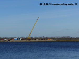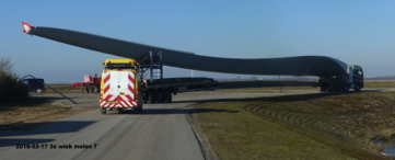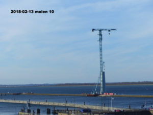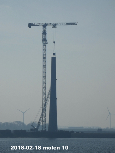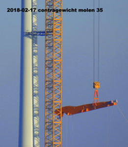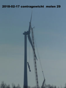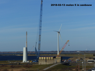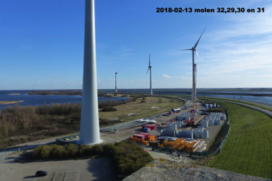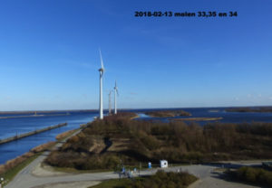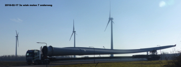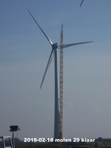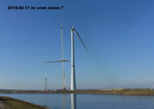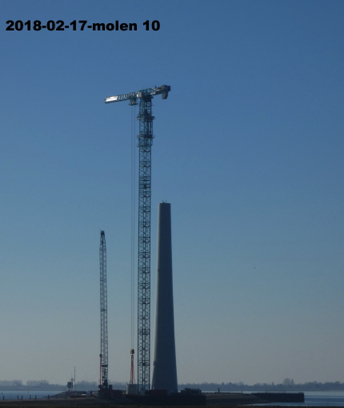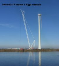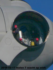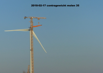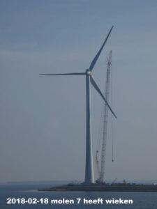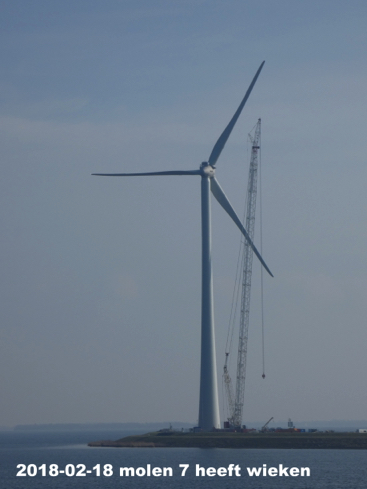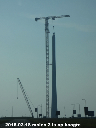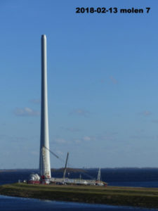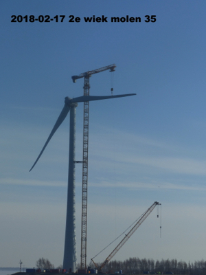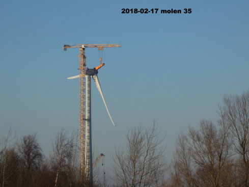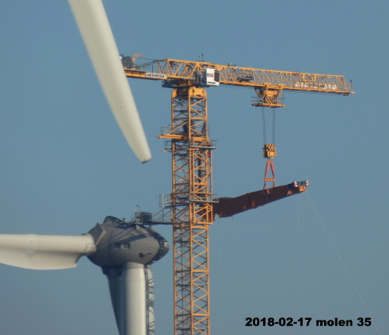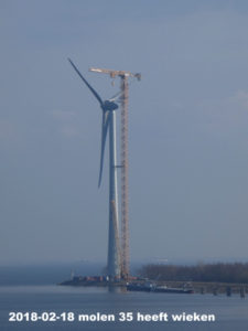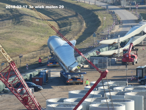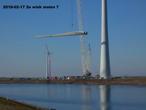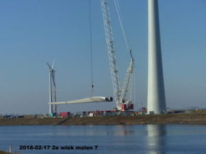 Op 17/2/18 werd er hard gewerkt op 5 locaties. Bij molen 2 en 10 werden ringen gehesen en molen 7, 29 en 35 kregen alle drie hun wieken. Zeker vanaf de uitkijktoren een spectaculair gezicht om zulke gevaartes de lucht in te zien gaan. Ook het transport van de wieken naar de molens is een mooi gezicht. Ik sprak verschillende bekenden die naar het hijsen kwamen kijken maar ook mensen uit Gelderland die de zeearenden wilden spotten en met enorme kijkers en telelenzen uren in de kou stonden te gluren als paparazzi op zoek naar een naaktfoto van een beroemdheid. Ze hadden alle tijd voor een praatje over duurzaamheid en participatie in windmolenprojecten en vertelden over een wijkaccu waarvoor ze een coöperatie hadden opgericht. Leuk om te horen hoe anderen ook met het milieu bezig zijn. Ze hadden een filmpje op youtube gezien over een zeearend die door een wiek van een windmolen geraakt werd en vroegen of men hier niet bang as dat de molens die zeldzame vogels weer zouden uitroeien. Ik kon vertellen dat onze molens detectoren hebben om zeearenden van ver te spotten en de molens direct te stoppen. Dat lijkt wel handig want de portier die ik vandaag sprak vertelde dat hij regelmatig een zeearend op het krammerterrein ziet om een konijntje te pakken en dat scheelt ons weer jagers in te huren om de konijnenfamilies binnen de perken te houden. Je ziet veel konijnenkolen op het terrein en voor je het weet hebben ze belangrijke kabels doorgeknaagd.