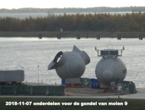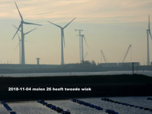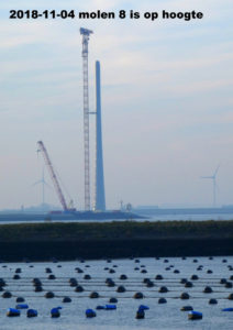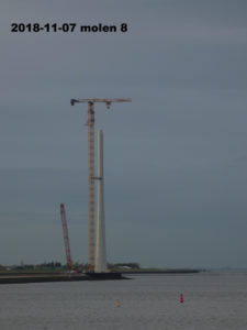 Ik kreeg een boeiende vraag van een jongen die met zijn vader op de toren kwam kijken. Waarom staat er op het terrein bij molen 13 waar alles voor molen 8 klaar ligt nog een betonnen ring terwijl de schacht al op hoogte is. Zijn ze een ring vergeten of is er eentje teveel afgeleverd? Ik weet het niet en beloofde het te zullen navragen. Via de website Windpark Krammer kun je vragen stellen en dat deed ik op zondagavond en maandag ochtend had ik al antwoord. De hoogte van molen 8 is correct en de losse ring bij het opslagterrein bij molen 13 is of afgekeurd door een beschadiging of een resterend reserveonderdeel. Er staan op het opslagterrein bij de pompgebouwen alleen nog ringen voor molen 23. De gondelonderdelen en de wieken voor molen 23 wachten bij molen 27 naast de laatste wiek voor molen 26.