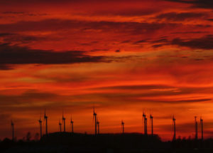 Dinsdag ging de zon heel mooi onder en maakte ik heel wat fotoâ??s van de windmolens met de rode luchten op de achtergrond.