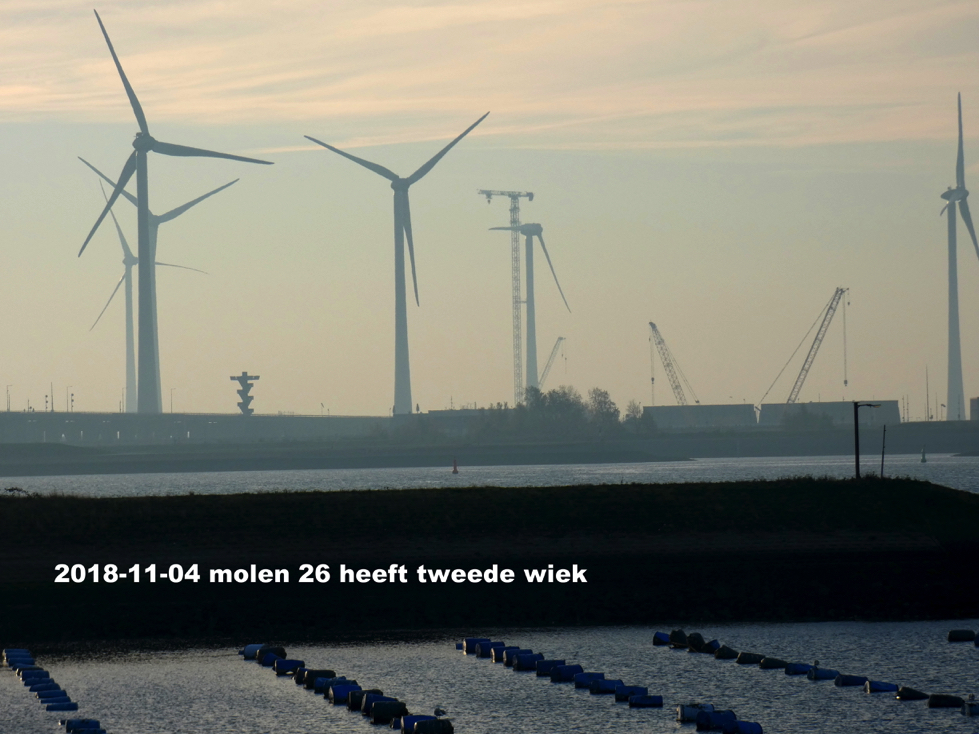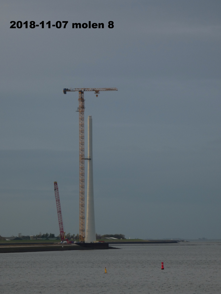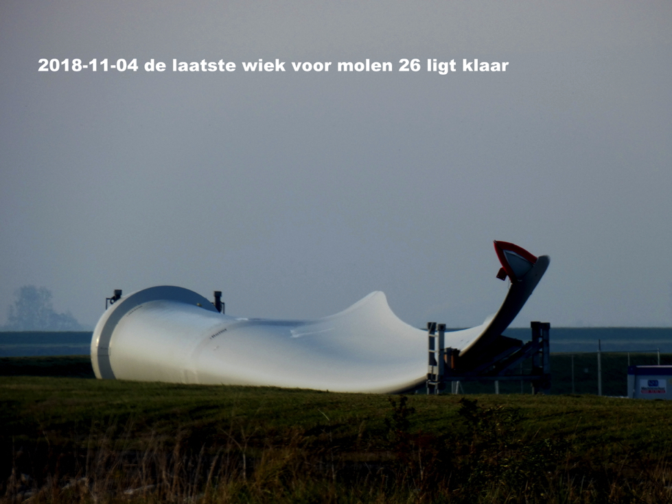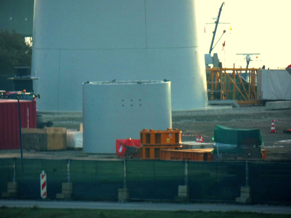 Ik kreeg een boeiende vraag van een jongen die met zijn vader op de toren kwam kijken. Waarom staat er op het terrein bij molen 13 waar alles voor molen 8 klaar ligt nog een betonnen ring terwijl de schacht al op hoogte is. Zijn ze een ring vergeten of is er eentje teveel afgeleverd? Ik weet het niet en beloofde het te zullen navragen. Via de website Windpark Krammer kun je vragen stellen en dat deed ik op zondagavond en maandag ochtend had ik al antwoord. De hoogte van molen 8 is correct en de losse ring bij het opslagterrein bij molen 13 is of afgekeurd door een beschadiging of een resterend reserveonderdeel. Er staan op het opslagterrein bij de pompgebouwen alleen nog ringen voor molen 23. De gondelonderdelen en de wieken voor molen 23 wachten bij molen 27 naast de laatste wiek voor molen 26.