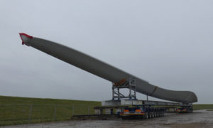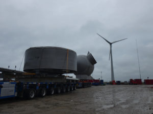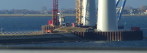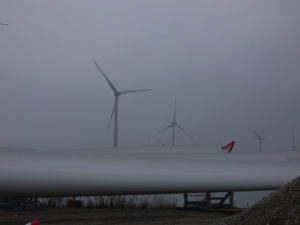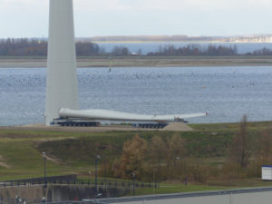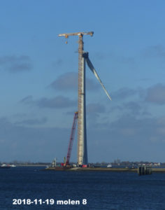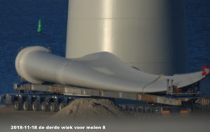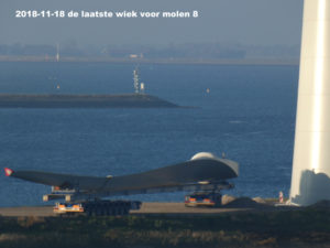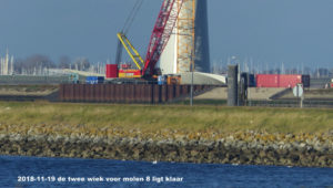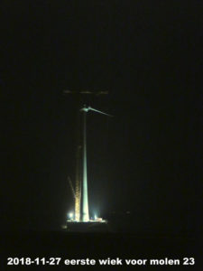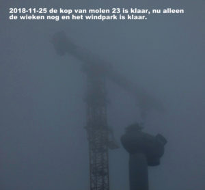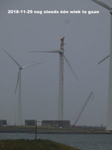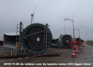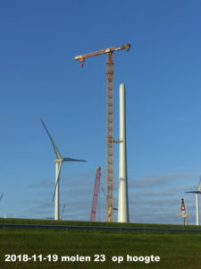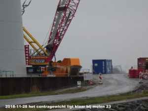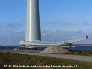 Toch werd er af en toe gehesen en opeens was molen 8 klaar en werd de hijskraan snel afgebroken en op het terrein bij molen 13 tijdelijk gestald. Ook zag ik molen 23 een gondel krijgen en midden in de nacht een eerste wiek en op 27 november overdag de tweede wiek. Op 28 november ging ik kijken of ik een foto van het hijsen van de laatste wiek van dit project kon maken maar het waaide te hard en het contragewicht om de molen in de juiste stand te zetten om de derde wiek te ontvangen lag nog werkeloos onder de molen. De laatste wiek lag nu wel al op een transportwagen maar nog wel op het terrein bij molen 27. Ik maakte veel fotoâ??s.