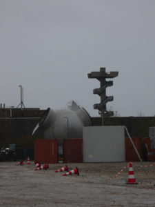 Ik trof ook een paar keer mensen die hoopten dat er gehesen zou worden bij molen 8 en molen 23 maar steeds was er te veel wind en lag het werk stil. Ook ik ben een paar keer tevergeefs naar de sluizen gereden maar genoot dan wel van de derde wiek die zo mooi bij molen 11 klaar lag voor molen 8. De gondel van molen 23 ligt klaar op het terrein dat je vanaf de uitkijktoren goed kunt zien. Een jongen van begin twintig wees me erop dat daar nog twee ringen liggen die niet gebruikt zijn en vroeg zich af wat men daar mee gaat doen. Gaan ze helemaal terug naar de fabriek of gebruiken we ze voor iets anders. Hij adviseerde ze ergens in de bewoonde wereld neer te zetten als plek waar graffitispuiters hun gang kunnen gaan. In Antwerpen had hij een muur gezien waar iedereen op mocht spuiten en het was prachtig en daardoor was er elders minder overlast van die spuiters. Je zou zoâ??n ring dan om de twee maanden weer wit kunnen schilderen zodat er dan nieuw werk gespoten kan worden. Misschien een idee voor de gemeente Goere-Overflakkee op het plein tussen de scholen en het gemeentehuis of op het Rubensplein?