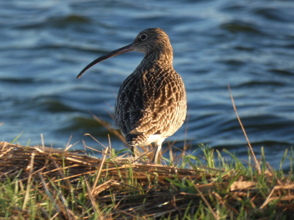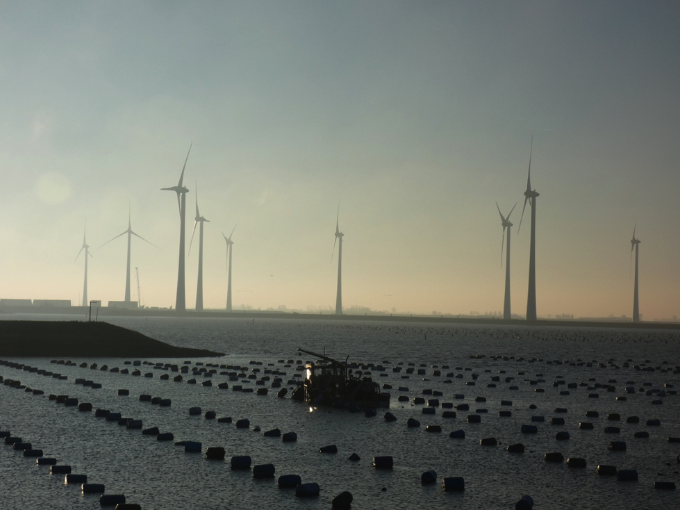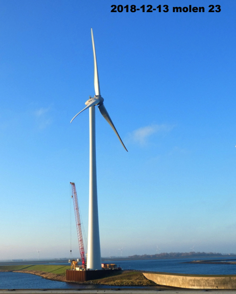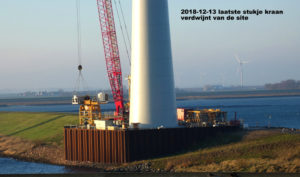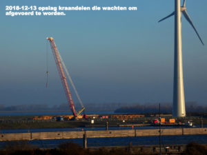 Met die kou en met het door de rijp witte landschap kom je een beetje in kerstsfeer als je door de mooie polders van Flakkee op weg bent naar de uitkijktoren om te kijken hoe het opruimen van alle bouwlocaties van het windmolenproject verloopt. De laatste kraan is afgebroken en er zijn activiteiten bij het opslagterrein bij molen 13 waar een schip is aangemeerd. Zouden de kraandelen per schip worden afgevoerd?