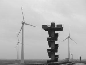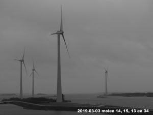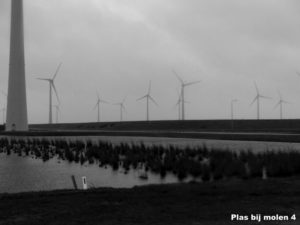 Ik was zondagmorgen om 7.30 al op de toren omdat ik de zonsopkomst wilde fotograferen maar het regende en de lucht was grijs en daarom maakten we maar eens alleen zwart-wit fotoâ??s. We zagen geen mensen en autoâ??s maar wel veel reeën op het natuurterrein tussen molen 35 en molen 28 en de vogels zongen al weer prachtig en trokken zich niets van de regen aan. De zeearenden waren niet te zien rond hun nest richting St. Philipsland en tot 8 uur zagen we nog geen vogelaars die van heinde en ver naar deze grote vogels komen kijken. Wat ons steeds opvalt is dat de Krammermolens zo weinig stil staan en alle 34 zo weinig geluid maken vergeleken bij de molens op ons eiland. Toen ik naar de vogelhut wilde gaan kwam er een auto het parkeerterrein bij de uitkijktoren op en ik ging er naar toe voor een praatje. Helaas kwam de man niet om de toren te beklimmen en onze mooie molens te bewonderen maar om zijn dochter op te pikken die twee nachtjes met haar vriend, die stuurman is op een containerschip, heeft meegevaren en nu in de Krammersluis van boord gaat om morgen weer uitgerust aan het werk te gaan in hun woonplaats Arnhem.
