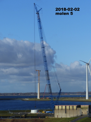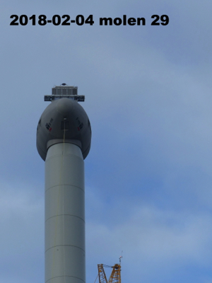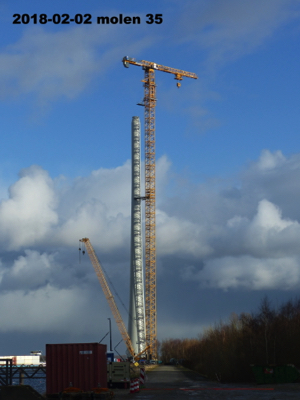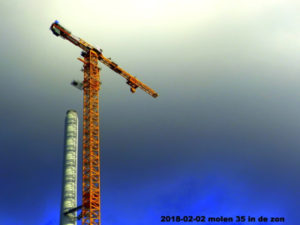 Vanwege een vakantie hebben we een week overgeslagen maar dat merk je nauwelijks omdat er vanwege de harde wind niet zo veel spectaculairs gehesen kon worden. Molen 7, 35 en 29 zijn op hoogte en 29 heeft zelfs al een stuk gondel.