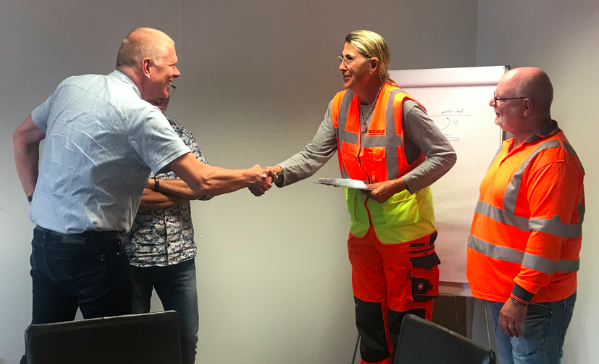 In juli is de veiligheidsoorkonde verdiend door de enige vrouwelijke vrachtwagenchauffeur op site. Annette Höfer van de Firma Neeb verdiende de oorkonde en de VVV-checques en ontving deze uit handen van HSE officer Gerrit Jansen.